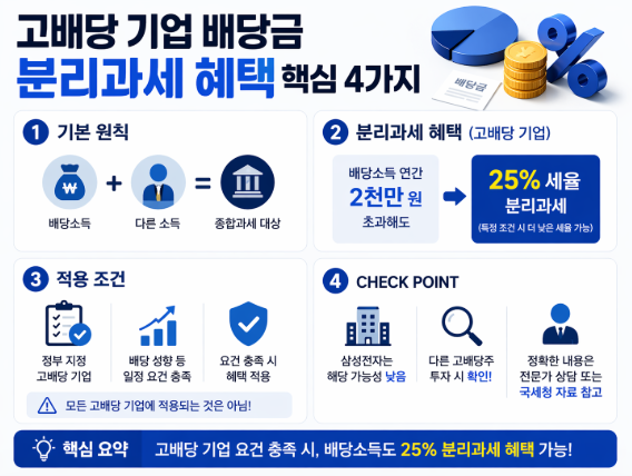 이게 무엇이냐면, 배당소득이 연간 2천만 원을 초과해도 종합과세 대상에 포함되지 않고 25%의 세율로 분리과세되거나, 특정 조건을 충족하면 더 낮은 세율을 적용받을 수도 있는 제도예요.
